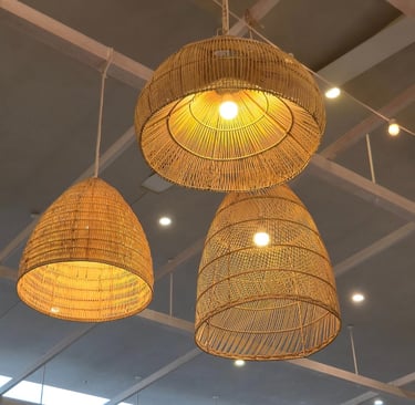 Lightweight paper, glass, or small metal pendants work well as ambient lighting.